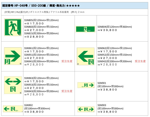 最上級認定基準のS50級を取得!LED光源の場合、200lxでも20分後に300mcd/㎡を超える超高性能製品です。改正消防法完全対応品で小規模店舗や商業施設での実績が多数ございます。