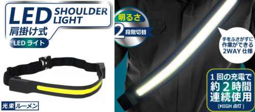 連続点灯時間(満充電時)HIGH/約2時間LOW/約6時間30分※点灯時間は目安です。充電状態や周囲温度により異なります。光束(約):HIGH/最大900Lm LOW/最大400Lm※実際の使用状況により明るさが異なる場合があります。使用環境温度:約5℃~40℃バッテリー容量:リチウムポリマー電池2400mAh/3.7V充電時間:約4時間※使用環境や使用頻度によっては、充電時間が変化します。充電プラグ入力電圧:DC5V充電プラグ入力電流:1.2A ※2A ACアダプター使用の場合付属品:USBケーブル(Type-C、約1m)、取扱説明書/保証書 ※ACアダプター別売り【保証期間】6ヵ月